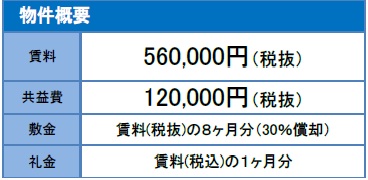 - 賃料 :賃料560,000円/月(税抜き) 共益費120.000円/月(税抜き)